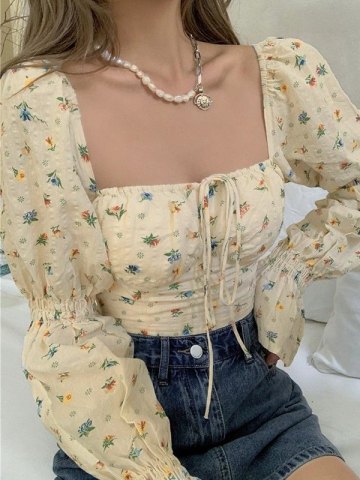 • EMMIOL Blusa de manga larga corta floral con manga farol