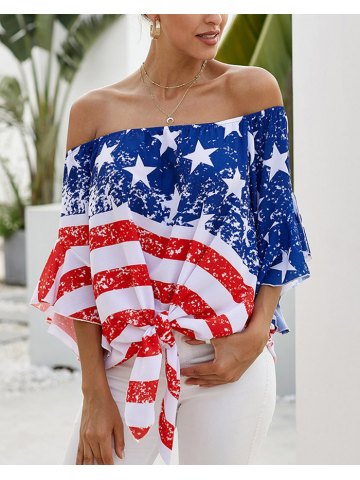 Camisa blusa anudada con hombros descubiertos y estampado de estrellas a rayas