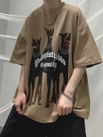 Descripción: Confeccionado con tela de algodón puro , estas camisetas gráficas para hombre presentaban un estampado de letras góticas y un perro ladrando, con una silueta relajada y un diseño de hombros caídos.