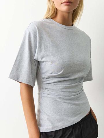 Cuello redondo, cintura plisada, manga corta
