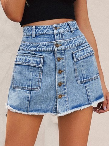 Estilo: Casual, Calle Color: Azul Contenido de la tela: Mezcla de algodón Tipo de ajuste: Regular Longitud: Por encima de la rodilla Diseño: Cierre de botón expuesto, Detalle de cintura doble, Dobladillo deshilachado