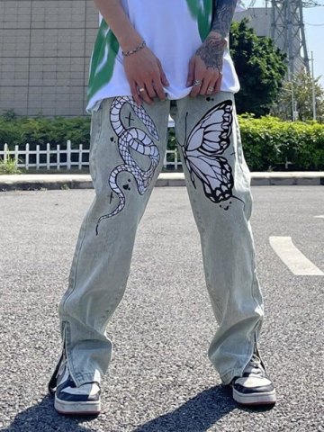 Jeans ajustados rectos con diseño de mariposa y serpiente para hombre