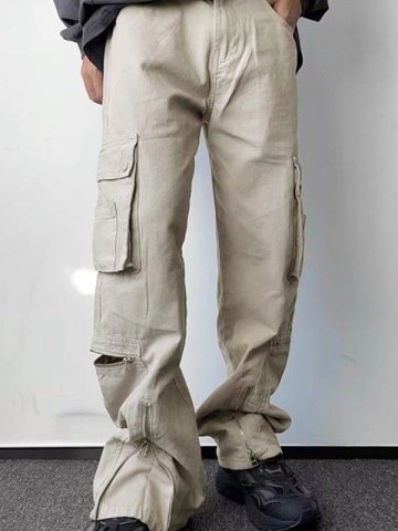 Descripción: Consigue estos elegantes pantalones tipo cargo inspirados en el punk para un ambiente fuera de servicio . Se corta a una silueta de pierna recta, presenta un diseño de cremallera en los tobillos, con bolsillos parcheados y un diseño de cierre con botón de cremallera.