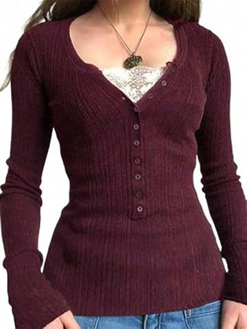 Top de punto de manga larga con botones y paneles de encaje