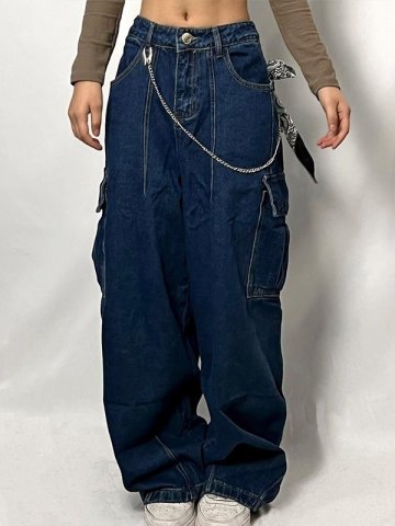 Descripción: Estos jeans de mezclilla de lavado oscuro tienen una silueta relajada, características Detalle de costura plisada en la pierna, con diseño de bolsillos estilo cargo, y bragueta de cremallera con botón metálico en la parte delantera.