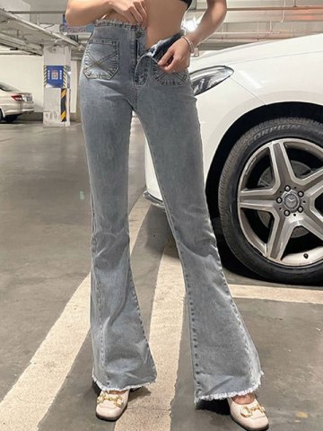 Estilo: Casual, Calle Color: Azul Material principal: Mezcla de algodón Tipo de ajuste: Acampanado Diseño de pierna: Cierre con cremallera y botón, Cintura de talle alto, Cintura y puños de corte sin procesar