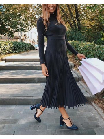 • EMMIOL Vestido de punto plisado de color sólido de longitud media
