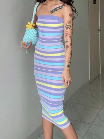 Descripción: Con una silueta ceñida al cuerpo, este vestido largo de verano presenta un estilo bandeau, con un diseño de banda elástica y un estampado de rayas de bloques de colores por toda la prenda.