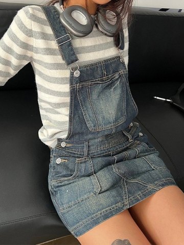 Descripción: este vestido tipo peto de mezclilla prepgirl con una forma por encima de la rodilla, cuenta con correas ajustables para los hombros, tiene cierre de botón de metal, detalles de costura con paneles y diseño de bolsillos con parches.